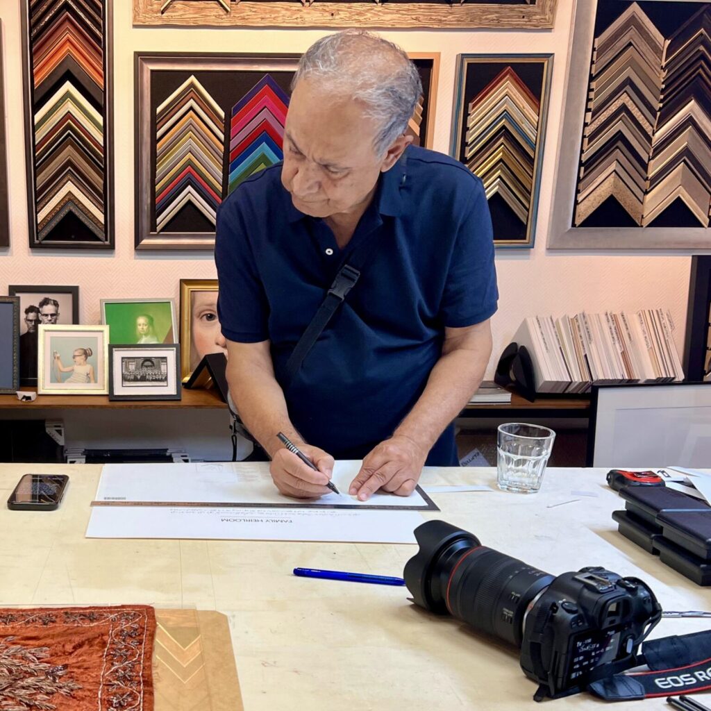 Het doek dat ik onlangs mocht inlijsten past in deze traditie. Wat het extra bijzonder maakt, is niet alleen de ouderdom en de kwaliteit van het zilverwerk, maar ook de persoonlijke toevoeging: de vader van de bruid schreef het verhaal van het erfstuk in het Perzisch op het passé-partout. Zo werd de lijst niet alleen een beschermende omlijsting, maar ook een tastbare brug tussen generaties.