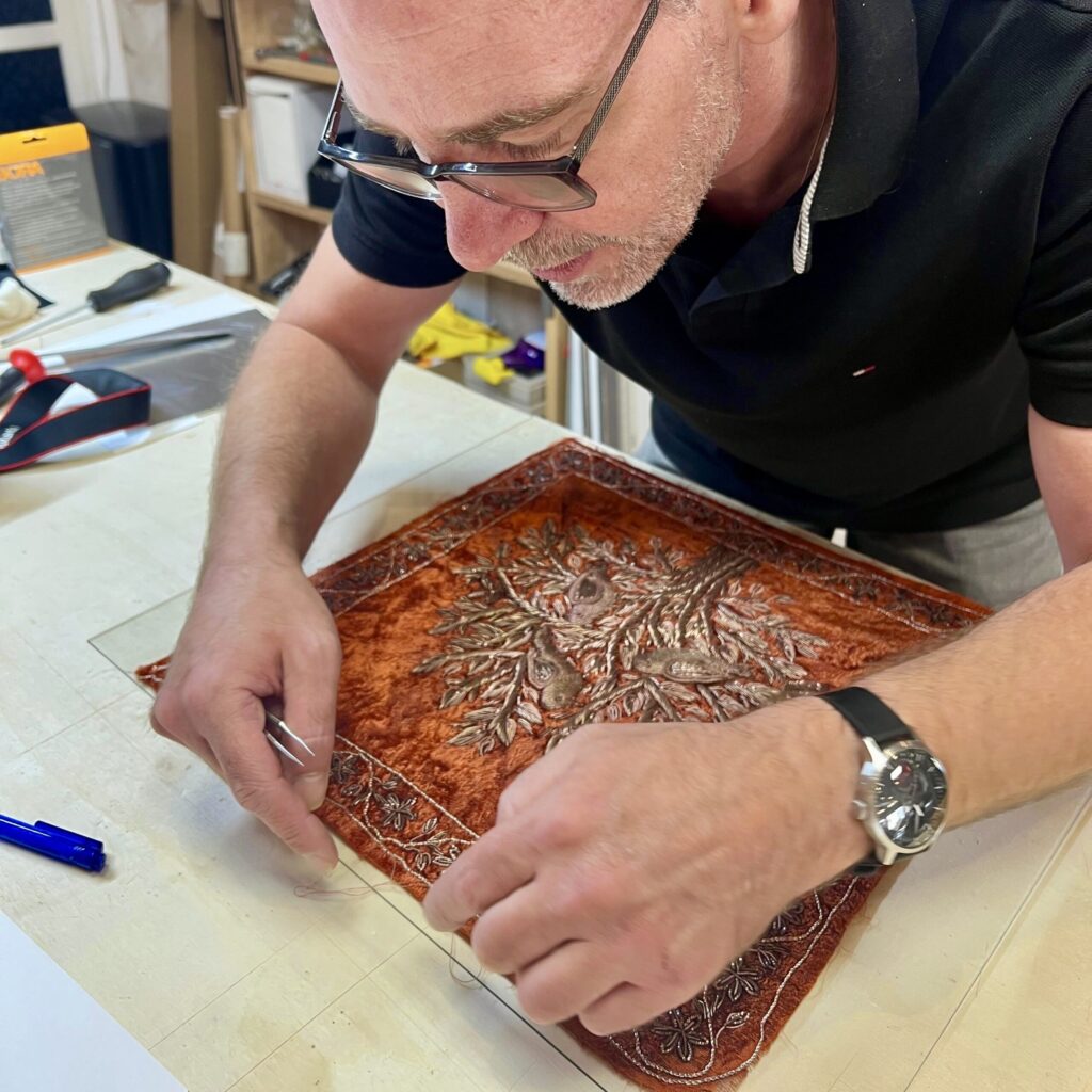 Soms komt er een opdracht binnen die meer is dan alleen inlijsten, zoals dit ongeveer 170 jaar oude doek met zilverdraad decoraties. Het is van generatie op generatie doorgegeven en destijds met de hand gemaakt door de verre voorouders uit de Qajar-dynastie van mijn klant.