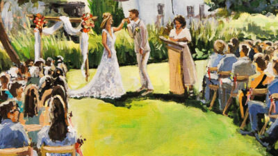 Een bruiloft vastgelegd op doek, live geschilderd door kunstenaar Susan Mertens en door ons ingelijst.